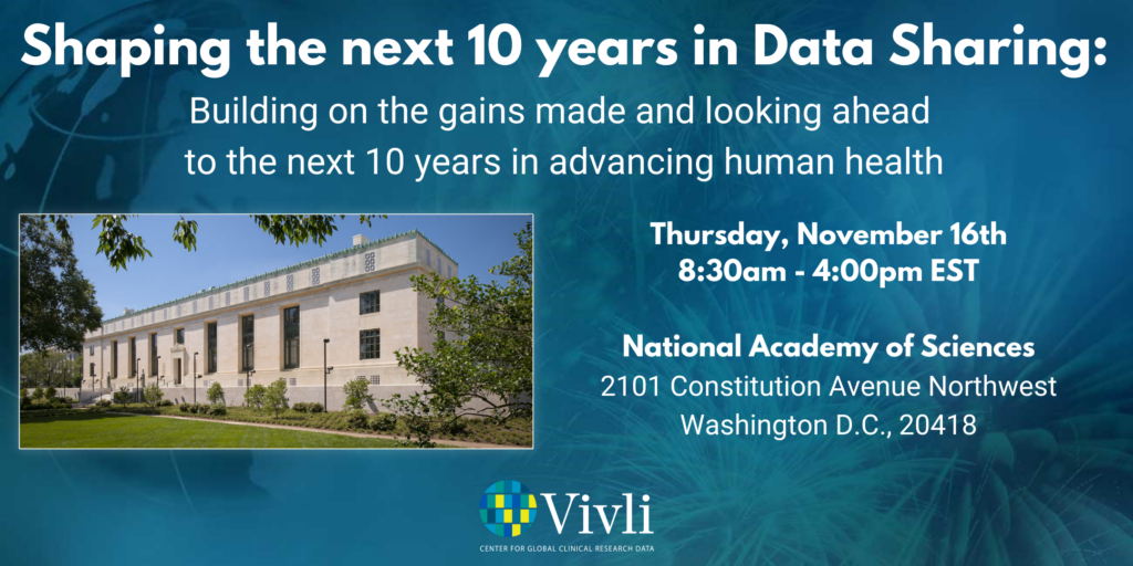 Please join Vivli at the National Academy of Medicine in Washington, DC on November 16, 2023 in Washington, D.C. for a strategic meeting to collectively reflect on the seminal 2015 IOM report Sharing Clinical Trial Data: Maximizing Benefits, Minimizing Risk to see how far we have come and chart a course to meet the challenges and opportunities that lie ahead.